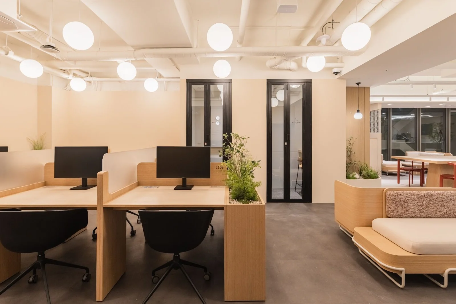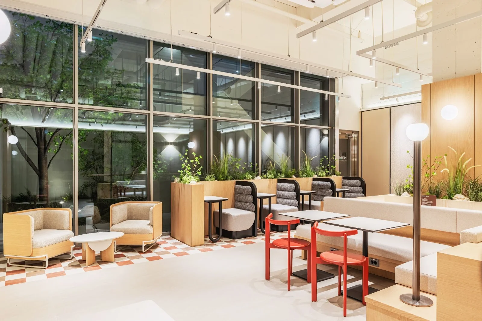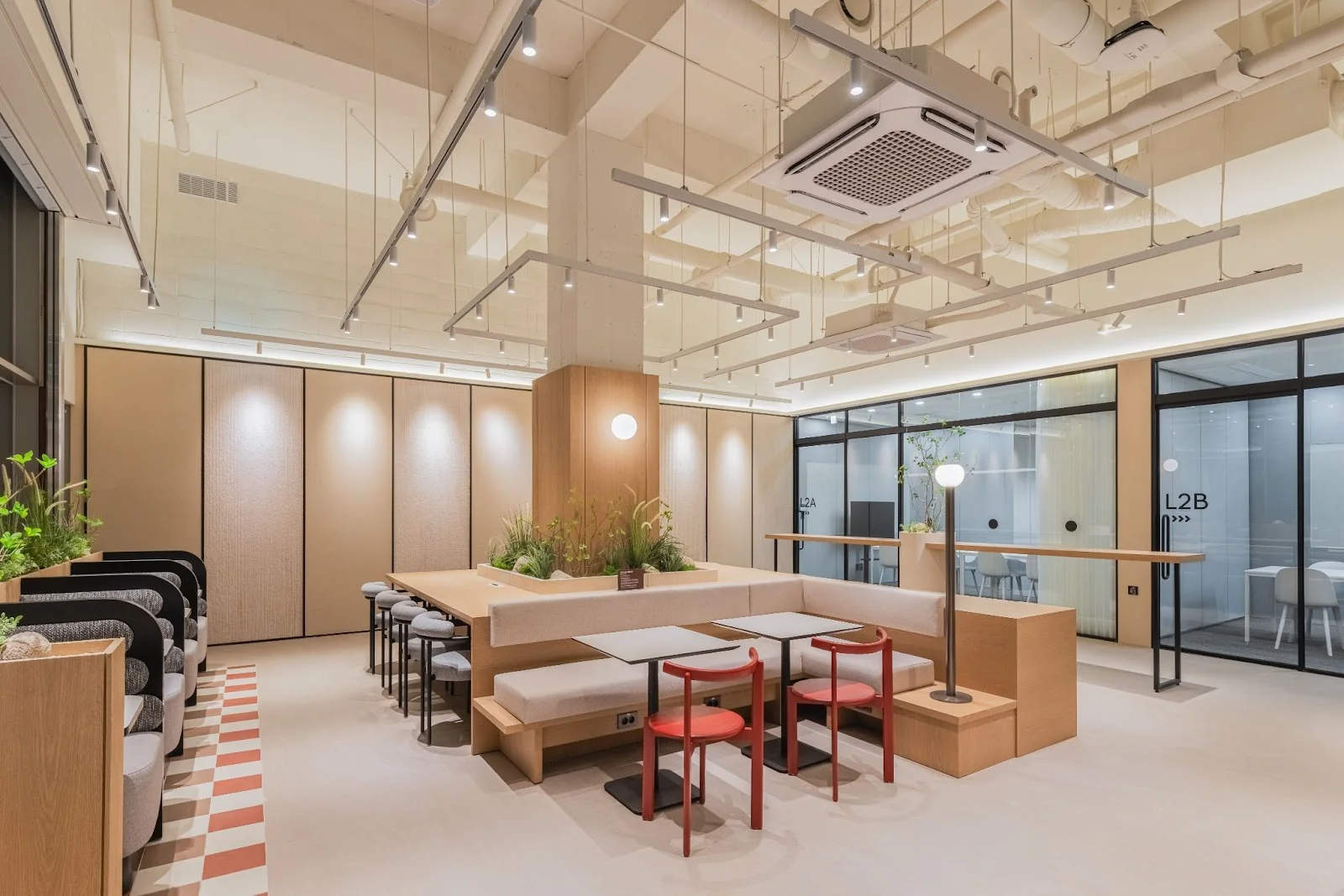 좌석은 긴 테이블, 소파형 부스, 1~2인용 테이블 등 다양한 형태로 구성했으며, 중앙 기둥 주변에는 플랜테리어와 간접조명을 배치해 라운지 한가운데서도 편안함과 생기를 느낄 수 있도록 했습니다.