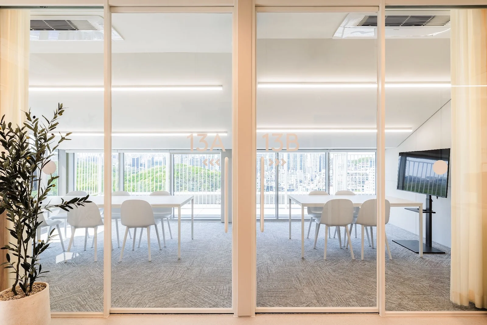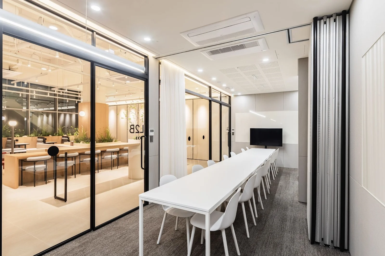 각 층에는 다양한 규모의 회의실을 마련했습니다. 특히 8인실과 6인실 사이에는 가변형 파티션을 설치해, 필요 시 벽을 열어 최대 14인까지 수용할 수 있도록 구성했습니다.