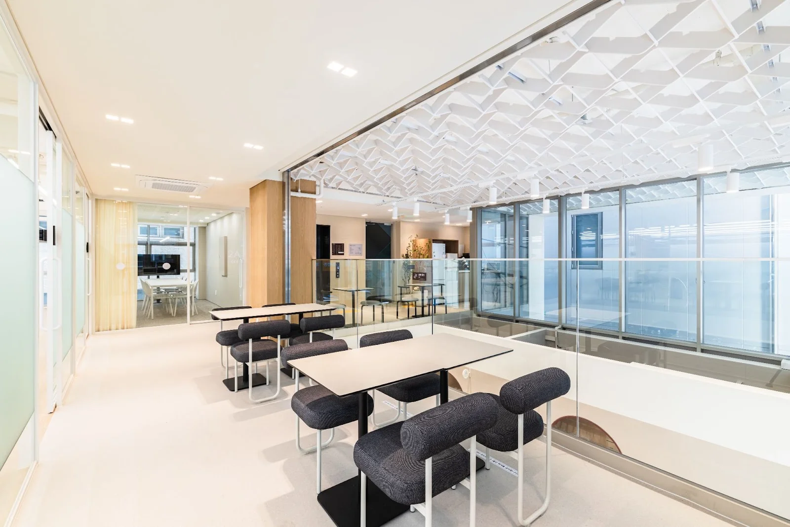 또한, 넓은 창을 통해 들어오는 자연광과 외부 풍경이 라운지 전체의 개방감을 극대화하며, 업무와 휴식이 자연스럽게 이어질 수 있도록 했습니다.