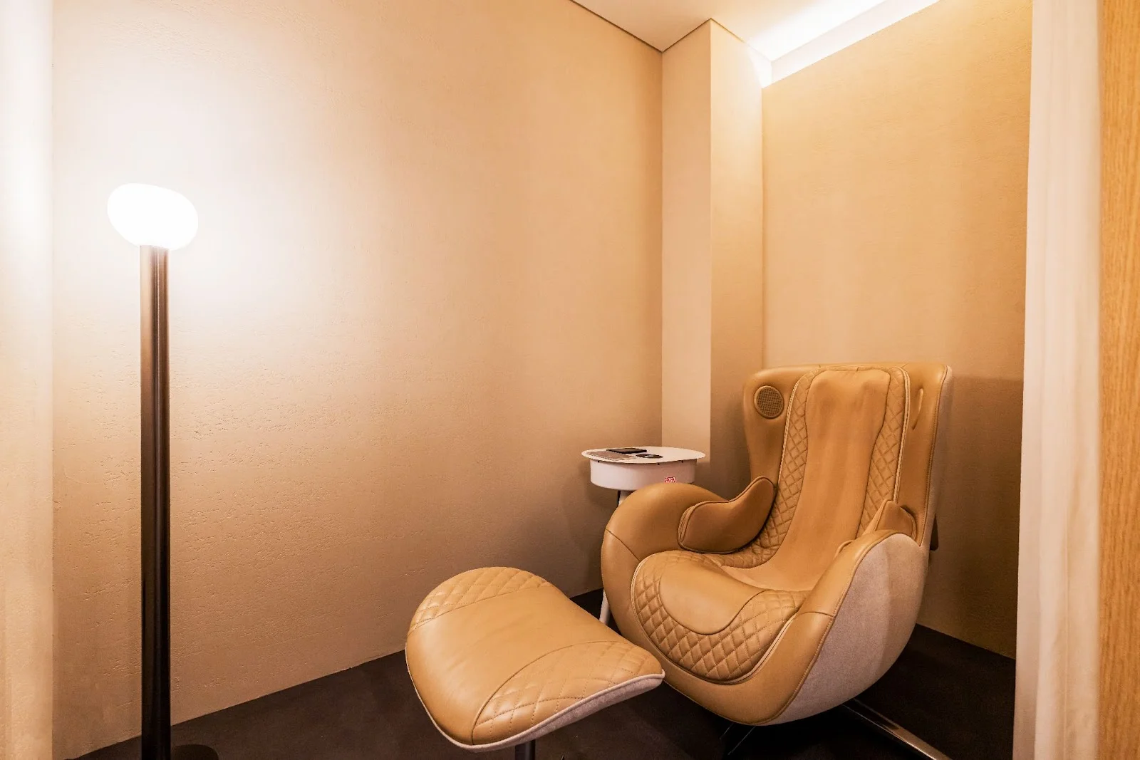 업무 중 잠시 쉬어갈 수 있도록 리차징 존을 마련했습니다. 따뜻한 조명과 편안한 안마 의자를 배치해 심리적 안정감을 주었으며, 근무 동선 가까이에 배치해 일과 휴식이 자연스럽게 이어지도록 구성했습니다.