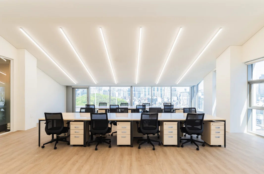 사무 공간은 최대한 창가 쪽으로 배치해, 업무 중에도 테헤란로와 선정릉이 내려다보이는 시원한 뷰를 즐길수 있도록 설계했습니다. 넓게 트인 창으로 들어오는 자연광이 공간 전체를 밝히며, 개방적인 분위기를 조성했습니다.