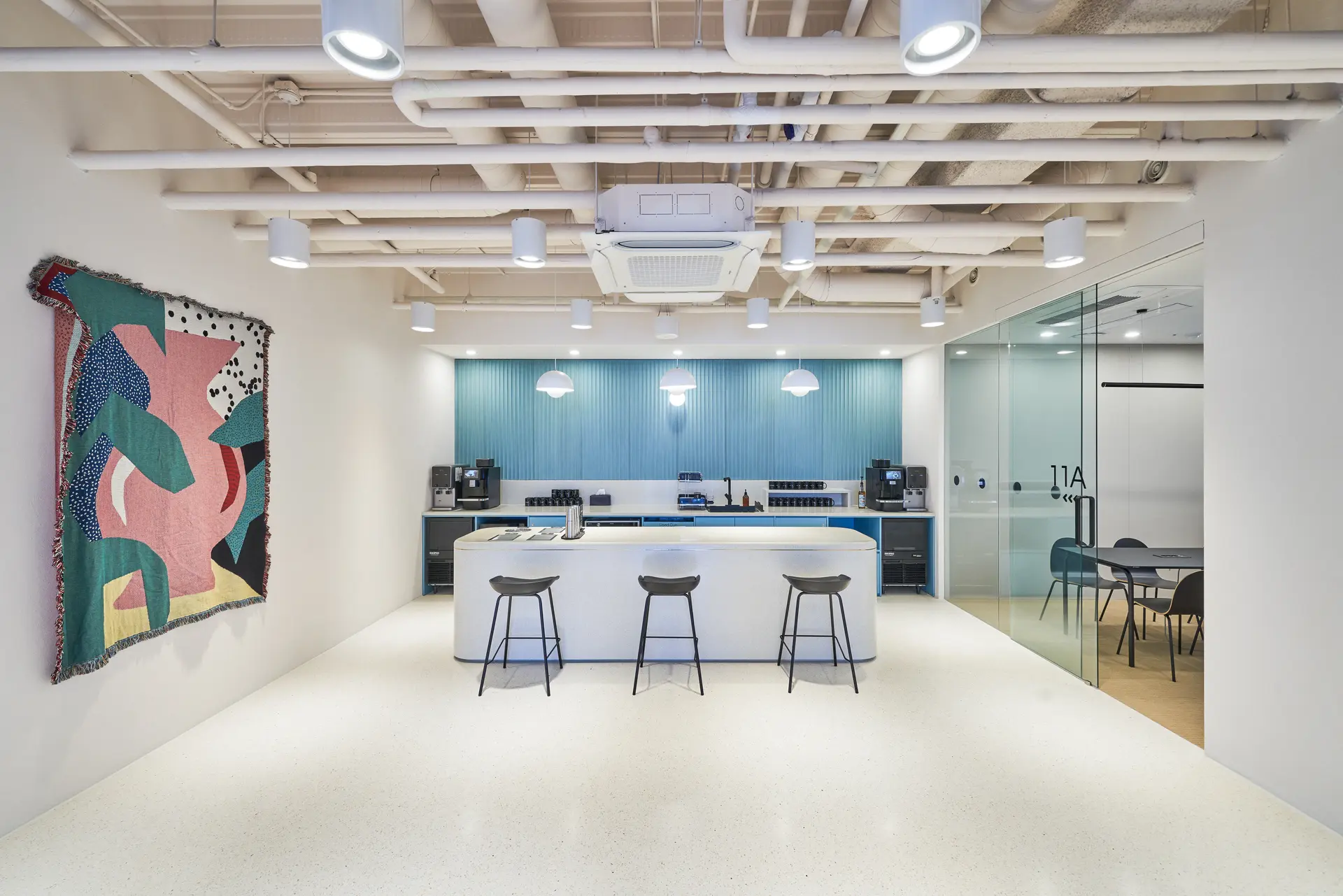 별도의 탕비실 없이 라운지의 한 영역에 캔틴 바를 조성했습니다. 싱크와 스낵바, 바 테이블까지 갖출 건 모두 갖춘 캔틴입니다. 라운지 영역 안에 있는 캔틴이기에 바닥재 마감을 달리해 영역을 구분했습니다. 벽돌벽과 세라믹 바 테이블의 조화가 편안하면서도 멋스럽습니다.