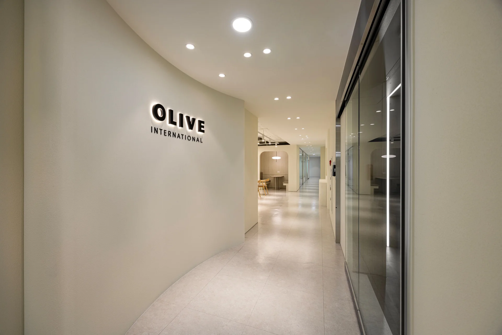 입구 공간은 올리브인터내셔널의 첫인상을 강렬하게 전달할 수 있도록 브랜드 사이니지를 배치했습니다. 특히 입구에 로고 월을 세워 외부 시선을 차단해 보안성을 높이고, 동시에 방문객이 들어서는 순간 브랜드 아이덴티티가 선명하게 각인되도록 했습니다. 스타코 마감 특유의 미세한 질감과 은은한 음영 효과를 활용해 공간에 깊이감을 더하고, 따뜻하고 자연스러운 분위기를 연출했습니다.