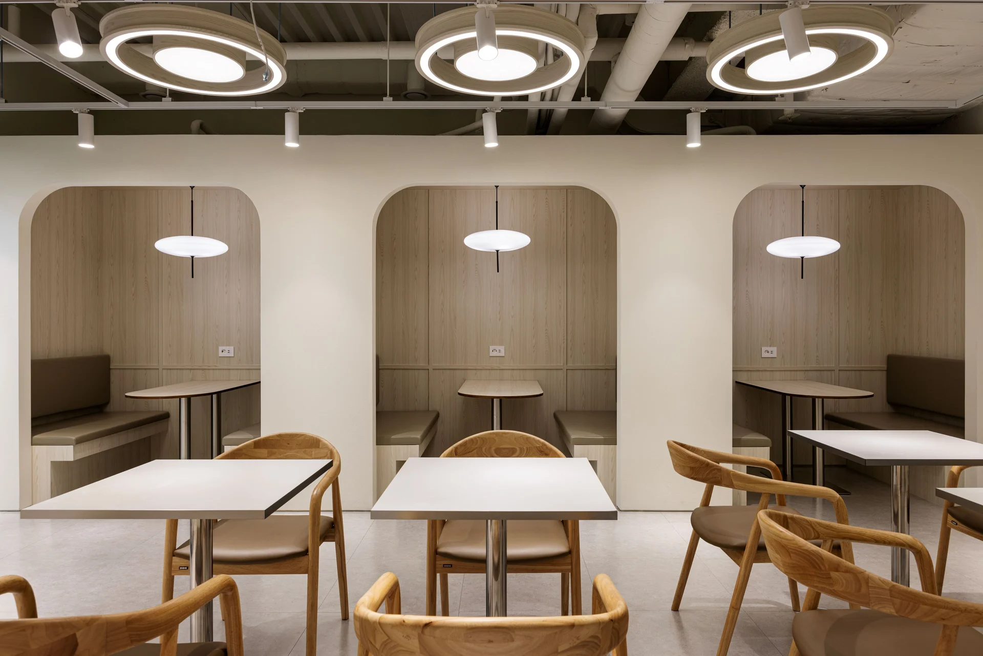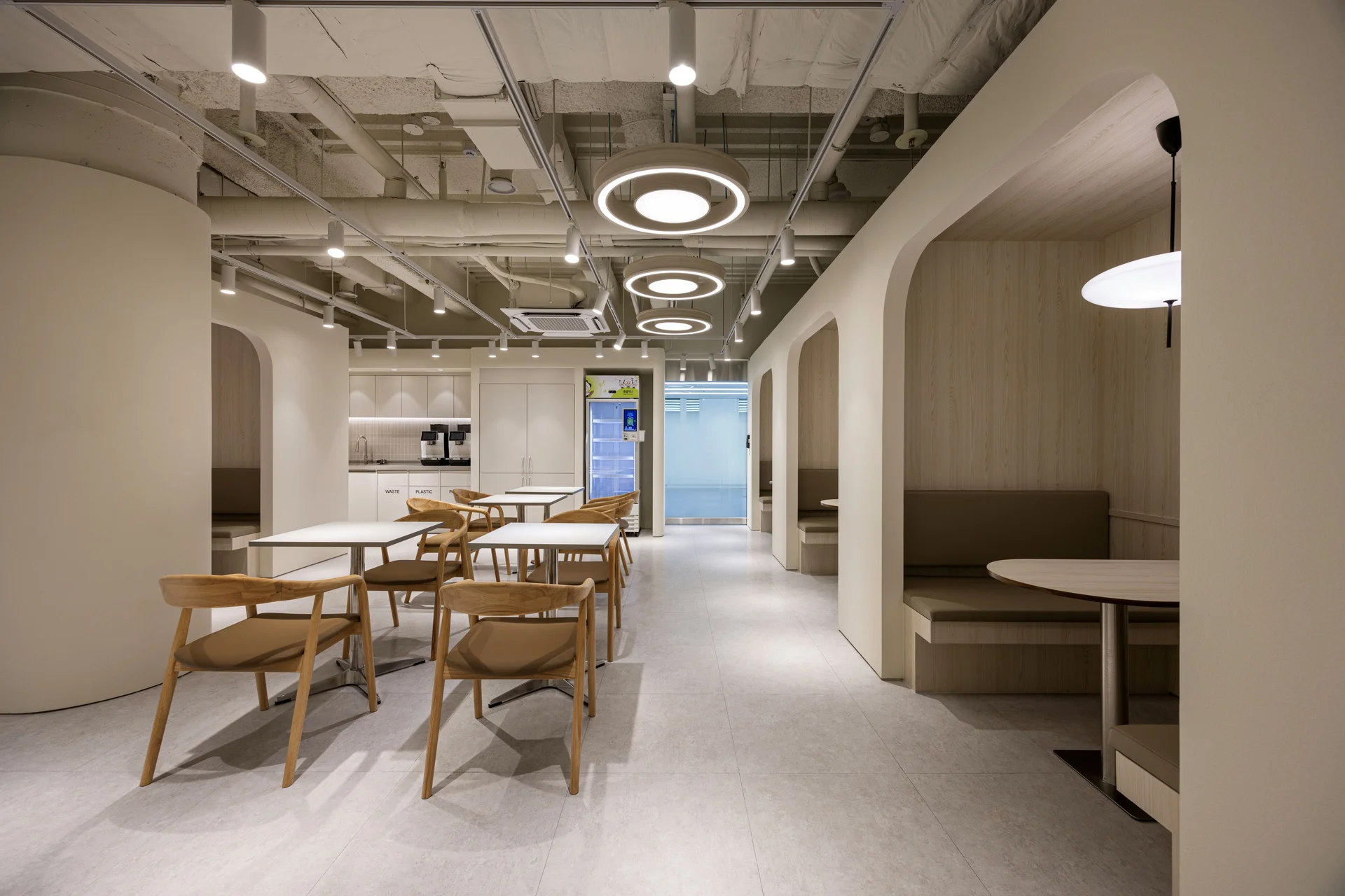 라운지 내부는 업무와 휴식, 짧은 미팅이 동시에 이뤄질 수 있는 유연한 공간으로 설계했습니다. 중앙에는 이동이 자유로운 테이블과 의자를 배치해 개인 업무부터 팀 미팅까지 상황에 맞게 활용할 수 있도록 했습니다. 또한 벽면에는 아치형 부스를 설치해 소규모 회의나 집중이 필요한 순간에도 사용할 수 있게 하였고, 천장에는 우드 링 타입 조명을 설치해 따뜻하고 아늑한 분위기를 완성했습니다.