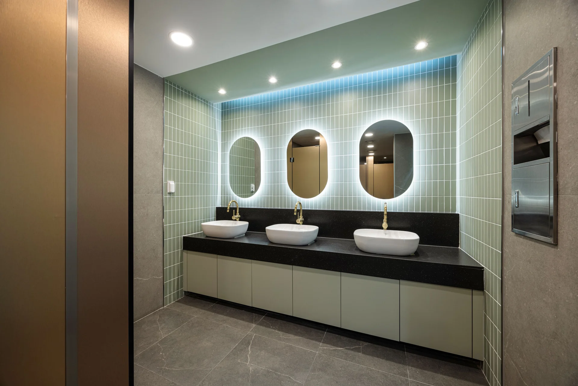 화장실은 공사 기간과 공사비 절감을 고려해 최소 공사 전략으로 효율성을 높였습니다. 기존 타일 위 타일 덧시공 방식을 적용해 공사 기간을 단축하는 동시에 시각적 개선 효과를 냈으며, 거울과 수납장 교체, 좌변기 증설, 큐비클 도어 신설을 통해 편의성을 강화했습니다. 또한 라인 조명과 그린 톤 포인트 타일을 더해 브랜드 톤과 일관된 이미지를 완성했습니다.