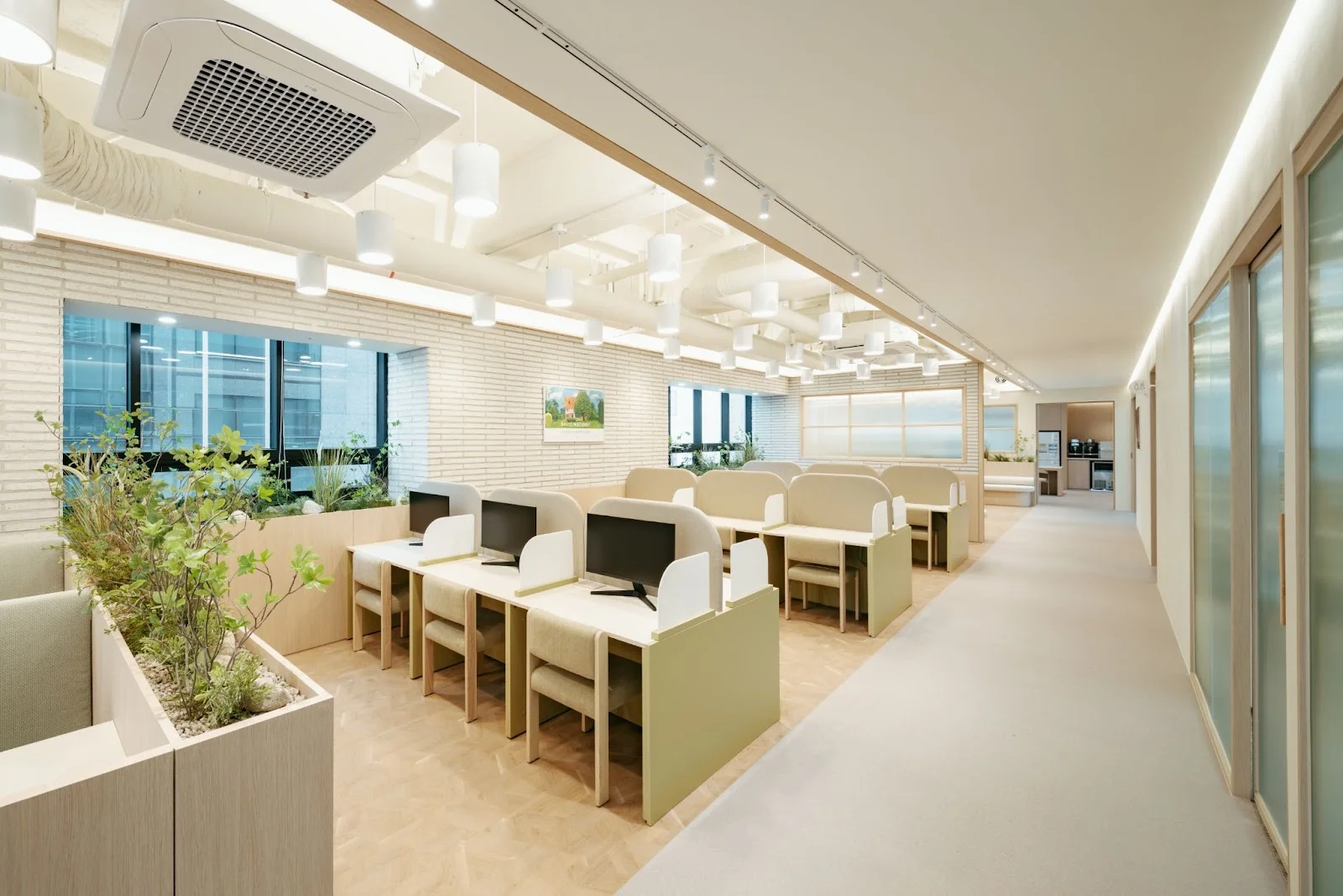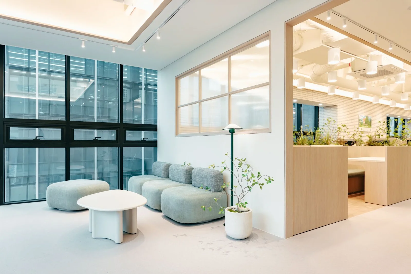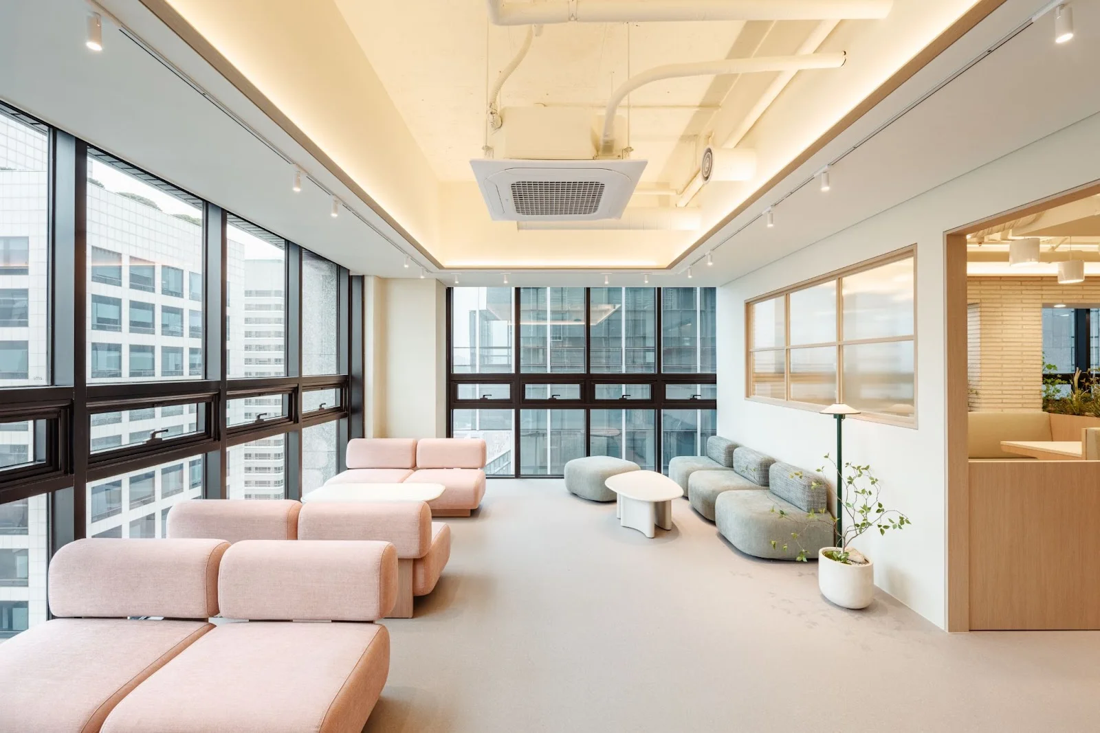 사무 공간은 최대한 창가 쪽으로 배치해 개방감을 확보했습니다. 테헤란로를 내려다보는 뷰가 업무 중에도 시각적인 여유를 주죠. 일정한 조도와 따뜻한 톤의 마감재를 사용해 장시간 근무에도 안정적인 환경을 유지할 수 있도록 했습니다. 바닥은 내구성이 높은 데코타일을 적용해 관리 효율성까지 높였습니다.