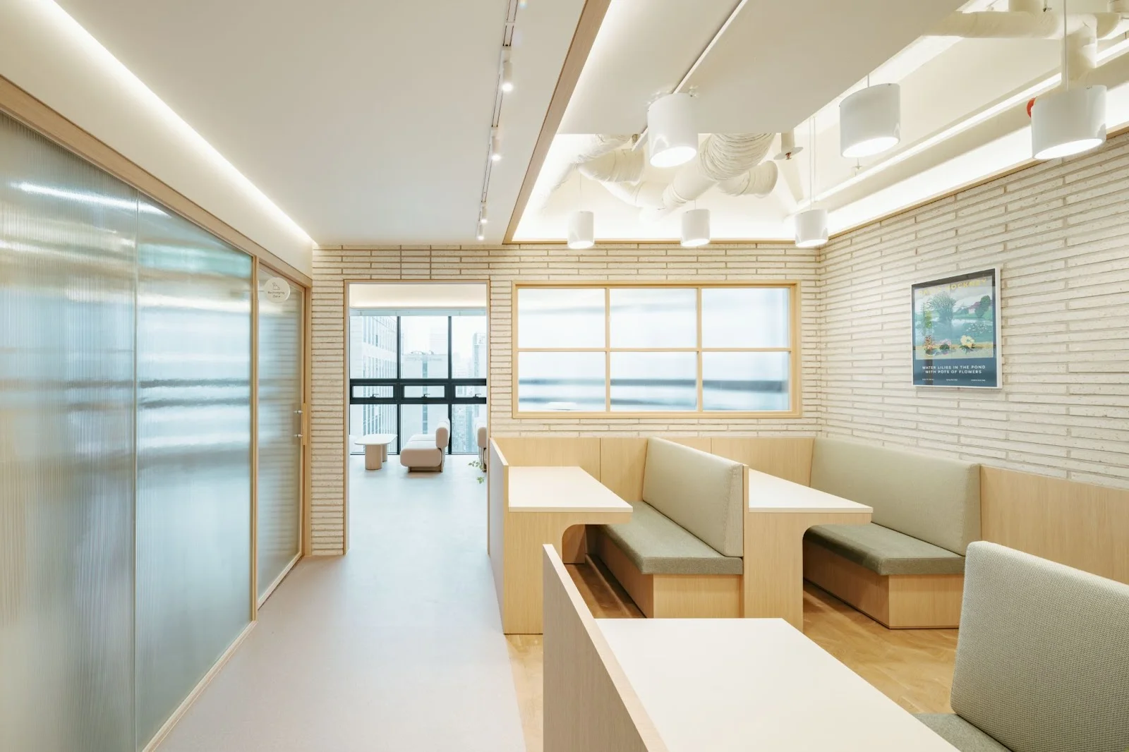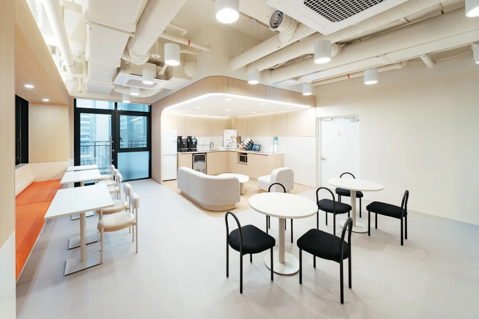 메인 라운지에서 입주사와 방문객이 가장 먼저 마주하는 웰컴존을 교류 중심 공간으로 완성했습니다. 우드 합판과 패브릭 소재를 조합해 따뜻한 질감을 살렸고, 붙박이 소파와 모듈형 가구를 배치해 티타임부터 회의까지 다양한 방식으로 활용할 수 있도록 구성했습니다. 노출 천장으로 개방감을 주었고, 원통형 펜던트 조명을 더해 밝고 단정한 분위기를 연출했습니다.