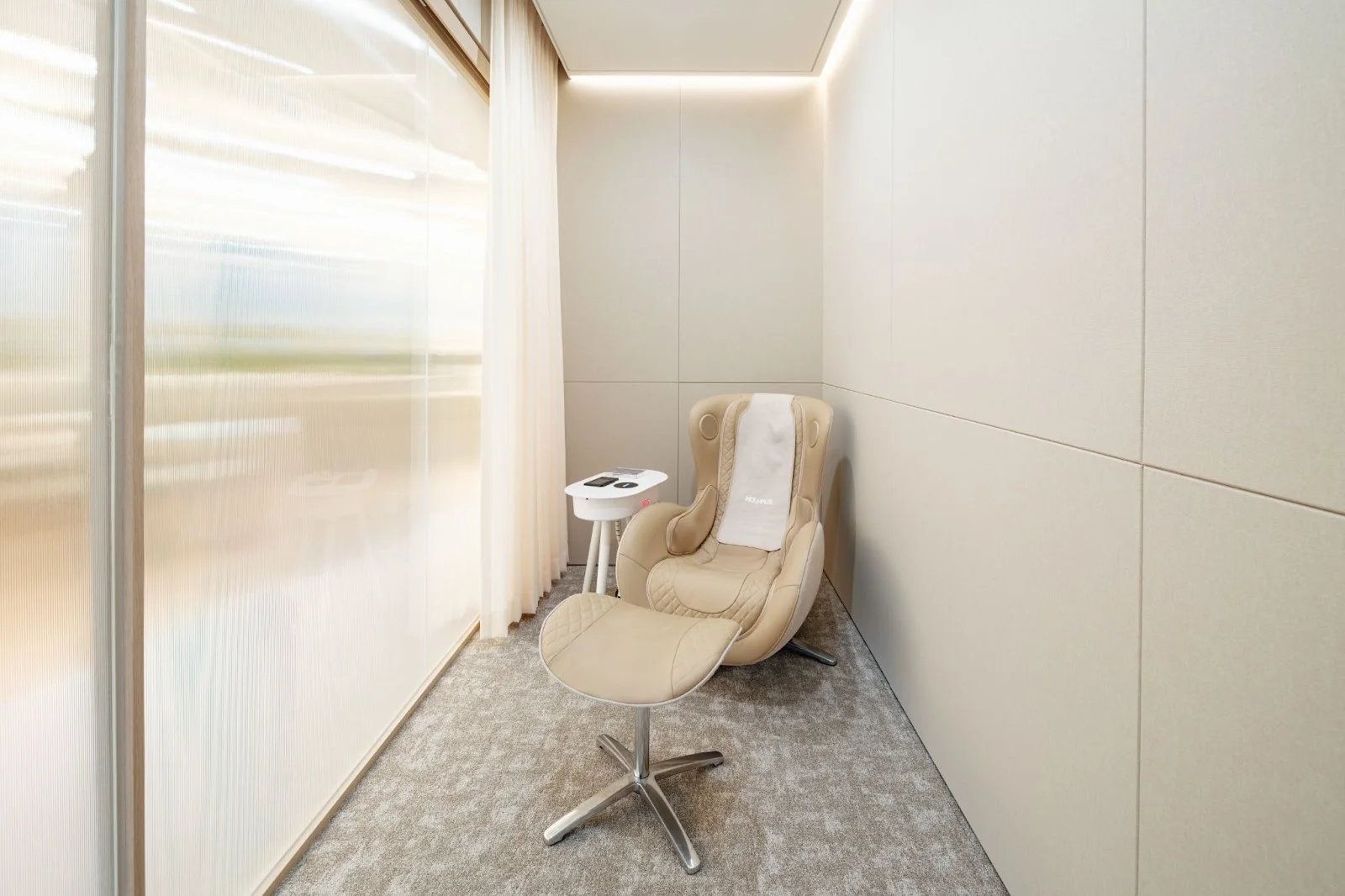 리차징 존은 휴식을 취할 수 있도록 마련한 공간입니다. 벽면에는 시선을 은은하게 차단하면서도 빛은 부드럽게 통과되도록 모루유리를 적용하였습니다. 덕분에 프라이빗함과 개방감을 동시에 느낄 수 있죠. 여기에 부드러운 패브릭과 따뜻한 조명을 배치해 편히 머물 수 있는 분위기를 연출했습니다.