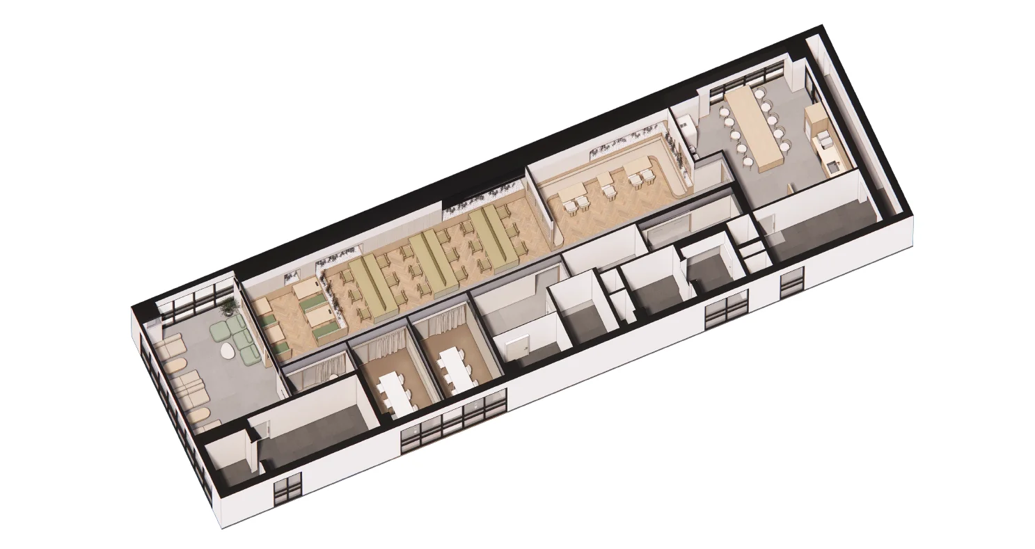 긴 건물의 특성을 활용해 다이닝 공간, 라운지, 포커스 존, 리프레시 존을 복도를 따라 순차적으로 배치했습니다. 덕분에 이동하는 동선 속에서도 다양한 공간을 경험할 수 있습니다. 창가 쪽은 최대한 개방하여 자연광을 끌어들이면서, 외관의 형태적 제약이 오히려 수직적 확장성과 공간의 연속성을 강화하는 요소가 되도록 설계한 것이죠.