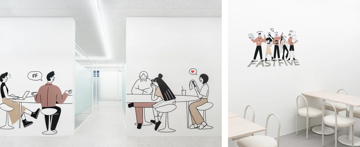 또한, 브랜드 아이덴티티를 공간에 녹여내는 것을 핵심으로 삼았습니다. 긴 복도와 넓은 벽면에는 패스트파이브 캐릭터인 '김패파' 일러스트를 적용해 단순한 장식을 넘어 브랜드 경험을 강화했습니다. 내부 곳곳에 활용된 다채로운 컬러는 활기를 더해, 입주 멤버분들이 패스트파이브를 더욱 친근하게 느낄 수 있도록 했습니다.